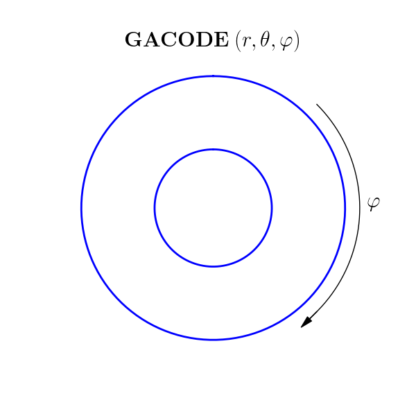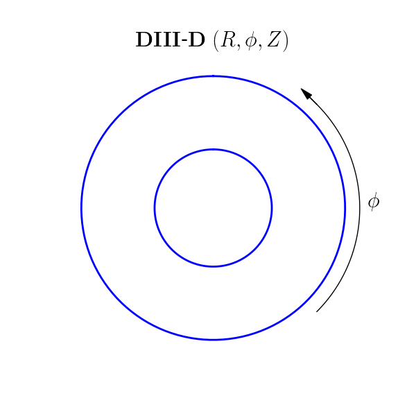 GACODE uses a right-handed (positively-oriented), field-aligned coordinate system \((r,\theta,\varphi)\), whereas DIII-D uses a (positively-oriented) cylindrical system \((R,\phi,Z)\). Looking down on the tokamak from above, the orientation of the GACODE toroidal angle is clockwise, whereas the DIII-D toroidal angle is counter-clockwise: